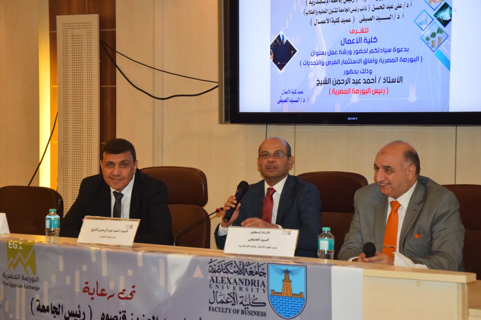 شارك أحمد الشيخ رئيس البورصة المصرية، كمتحدث رئيسي في ورشة عمل نظمتها كلية الأعمال بجامعة الإسكندرية بعنوان "أسواق المال وآليات الاستثمار في بورصة الأوراق المالية المصرية" وذلك في إطار حرص البورصة المصرية على نشر الوعي المالي والثقافة المالية بين الطلاب.