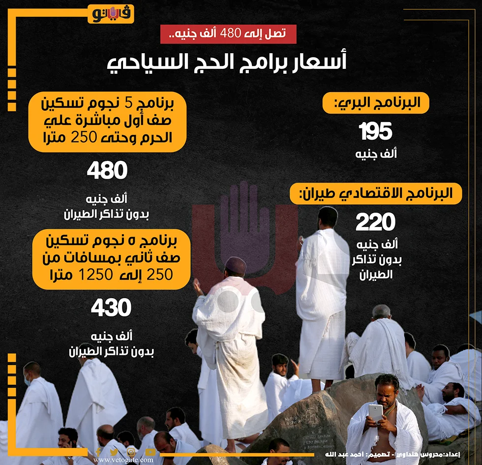 وأضاف وحيد عضو الجمعية العمومية لغرفة شركات السياحة بوسط الدلتا لـ«فيتو»، أن أسعار برامج الحج السياحي للعام الجديد 1445هـ ستبدأ من 195 ألف جنيه للبرنامج البري بزيادة 65 ألف جنيه، فيما سيصل سعر البرنامج الاقتصادي طيران إلى 220 ألف جنيه بزيادة 90 ألف جنيه بدون تذاكر الطيران.