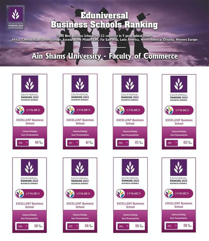 أعلن الدكتور خالد قدرى عميد كلية التجارة جامعة عين شمس تقدم تصنيف كلية التجارة جامعة عين شمس عالميًا، ليحقق 118% عام 2023، ليصبح فى فئة Excellent Business School وفقًا للتصنيف العالمى Eduniversal Business Schools Ranking، وذلك ضمن أفضل 1000 كلية أعمال Business School على مستوى 153 دولة.