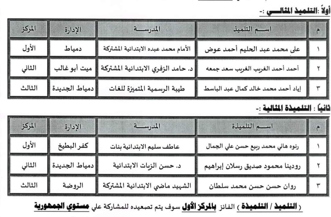 ( التلميذ / التلميذة ) الفائز بالمركز الأول سوف يتم تصعيده للمشاركة على مستوى الجمهورية