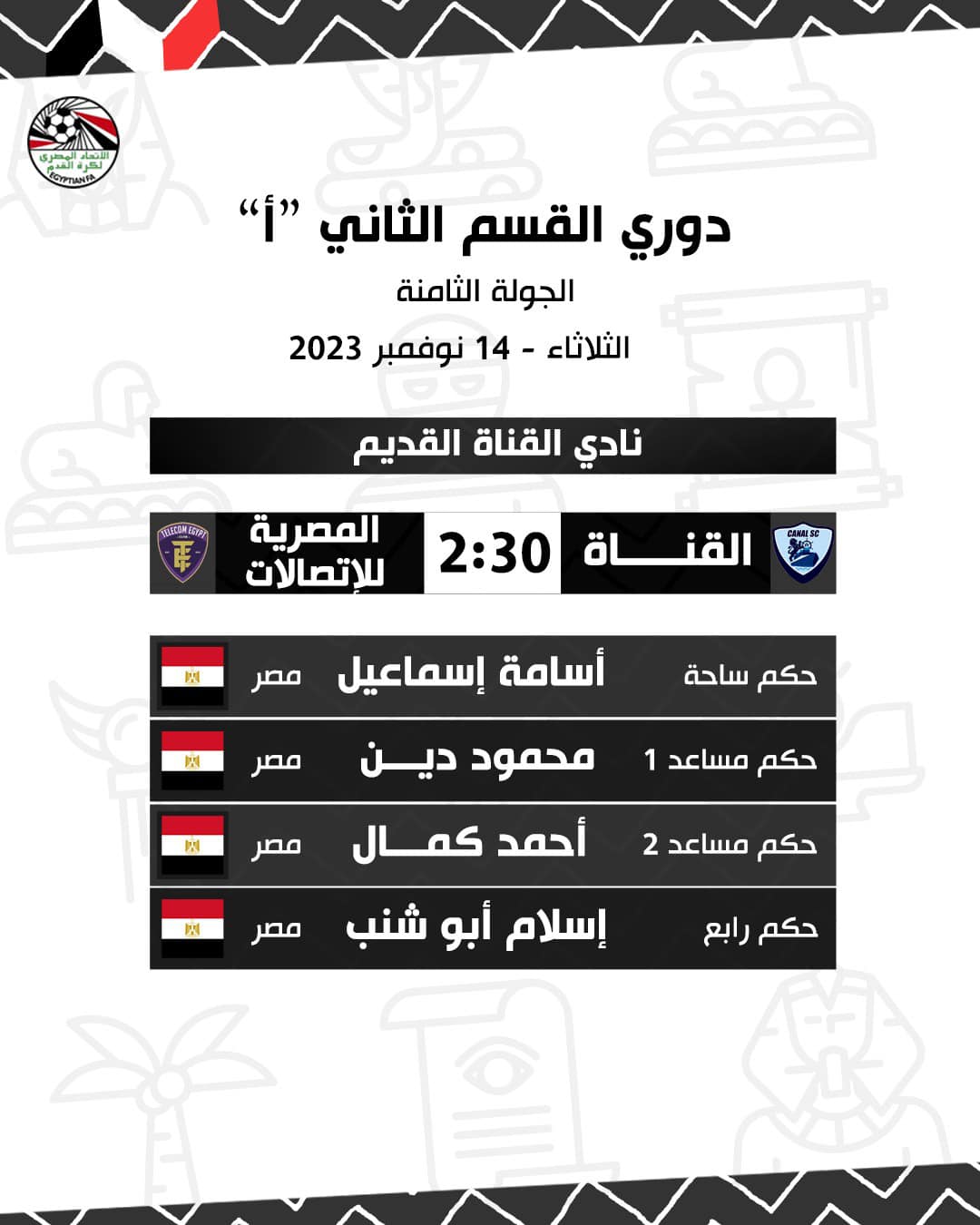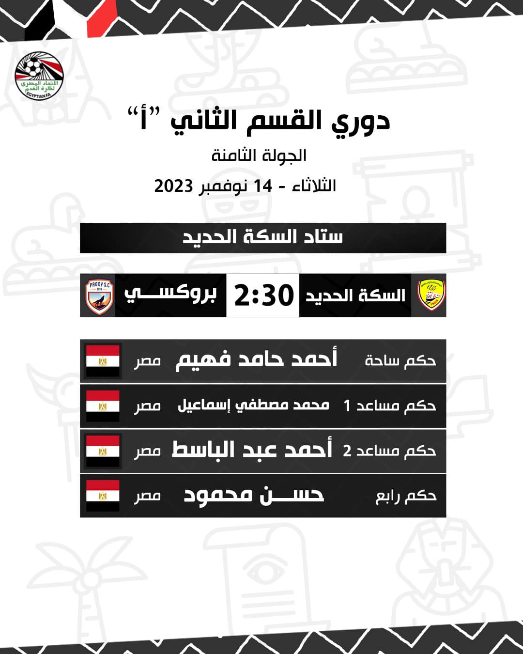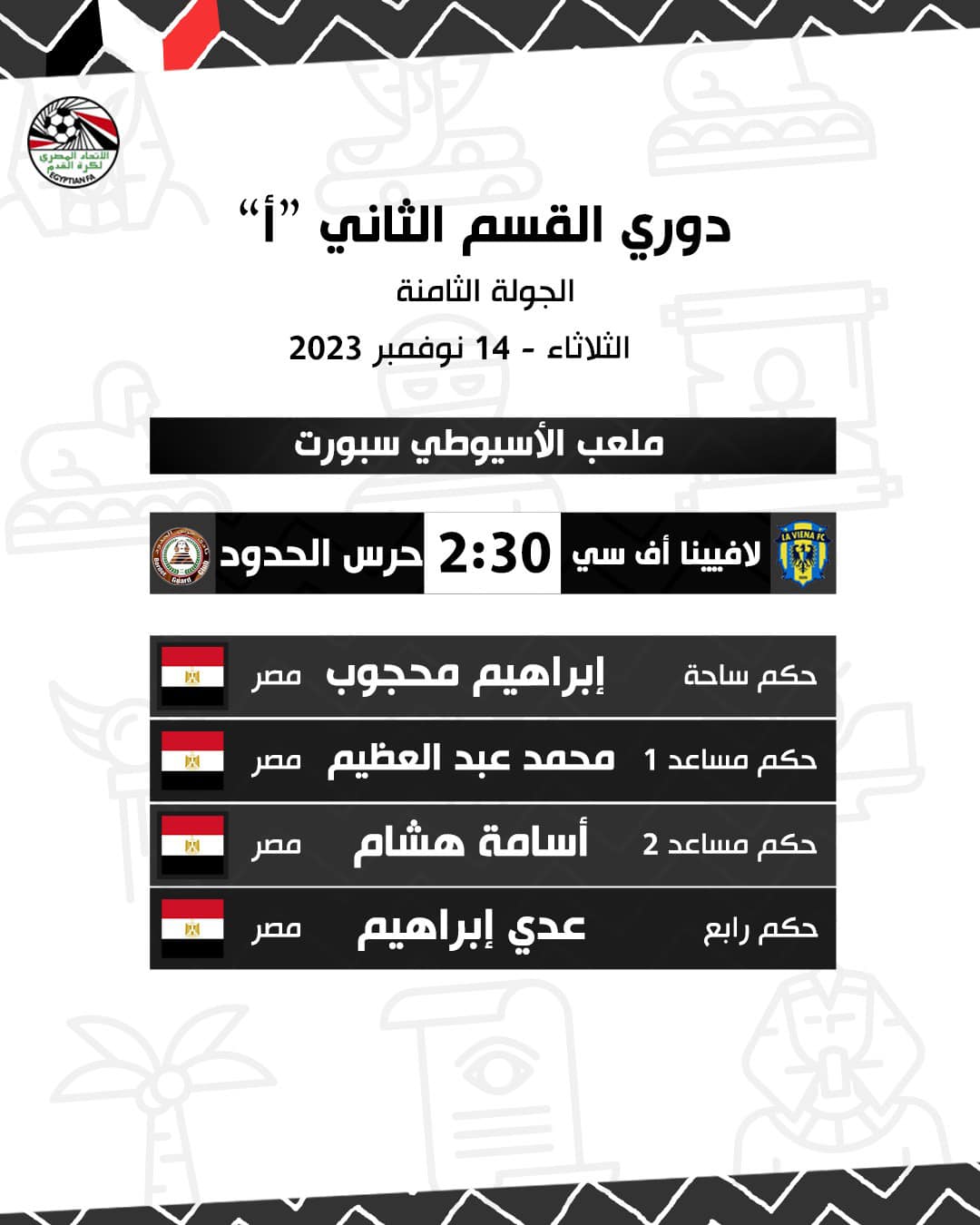 دوري المحترفين، أعلنت لجنة الحكام باتحاد الكرة حكام مباريات اليوم الثلاثاء في الجولة الثامنة من دوري القسم الثاني "أ" "دوري المحترفين".