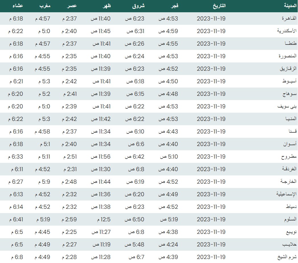 مواقيت الصلاة اليوم وفقًا للتوقيت المحلي لمدينتي القاهرة والإسكندرية وكذلك، مواقيت الصلاة، لعدد من مدن ومحافظات الجمهورية من واقع بيانات الهيئة العامة للمساحة