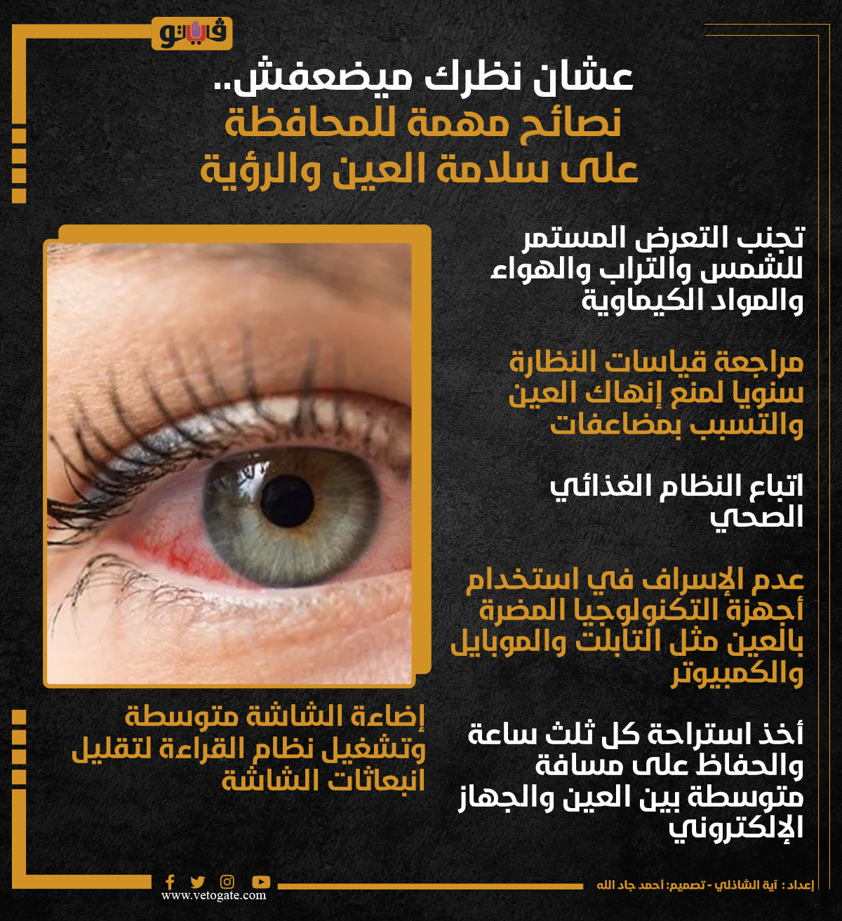 عشان نظرك ميضعفش.. نصائح مهمة للمحافظة على سلامة العين والرؤية (انفوجراف) الأربعاء 15/نوفمبر/2023 - 02:43 م 11/15/2023 2:43:17 PM الحفاظ على سلامة العين، فيتو آية الشاذلي شارك طباعة 18 حجم الخط شارك طباعة المواد الكيماوية التكنولوجيا العين الحفاظ على سلامة العين شاشة الهاتف النظر الإبصار