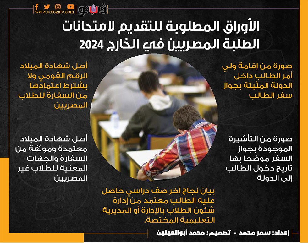الأوراق المطلوبة للتقديم لامتحانات الطلبة المصريين في الخارج 2024 (إنفوجراف) الجمعة 17/نوفمبر/2023 - 07:00 م 11/17/2023 7:00:17 PM امتحانات الطلاب المصريين في الخارج سمر محمد شارك طباعة 18 حجم الخط شارك طباعة المصريين في الخارج امتحانات الطلبة المصريين في الخارج جواز سفر