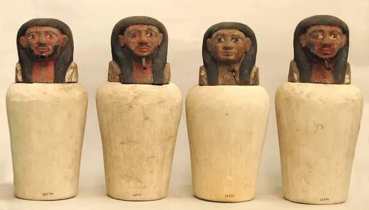 وكانت الأوانى فى البداية ذات أغطية مسطحة، ثم أصبحت ذات رؤوس آدمية شكلها قريب من المُتوفى، وبعد ذلك أصبح لكل إناء غطاء مميز، له شكل أحد "أبناء حورس الأربعة"، لتُوضع الأحشاء الُمنتزعة تحت حمايتهم.
