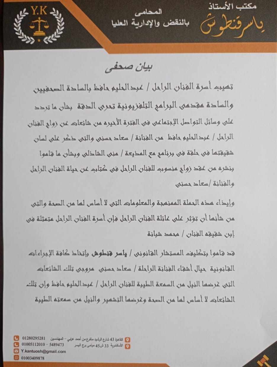 وأضاف شبانة في بيانه، وإيذاء هذه الحملة الممنهجة والمعلومات التي لا أساس لها من الصحة والتي من شأنها أن تؤثر على عائلة الفنان الراحل، فإن أسرة العندليب متمثلة في ابن شقيقه الفنان محمد شبانة قد قاموا بتكليف المستشار القانوني باتخاذ كافة الاجراءات القانونية حيال اشقاء الفنانة سعاد حسني مروجي تلك الشائعات التي غرضها النيل من السمعة الطيبة للفنان الراحل وأن تلك الشائعات هدفها التشهير والنيل من سمعته.
