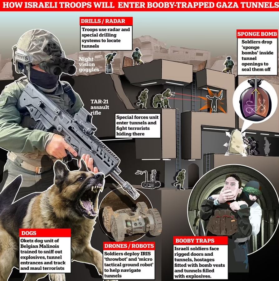 قالت صحيفة “ديلى ميل” البريطانية، اليوم، إن قوات الاحتلال الإسرائيلية تستعد لاقتحام أنفاق حركة حماس بقطاع غزة، مشيرة إلى أن الجنود الإسرائيليين سيواجهون الآن أخطر مراحل الغزو البرى لدى دخولهم الممرات الضيقة، حيث ينتظرهم مقاتلو حماس.