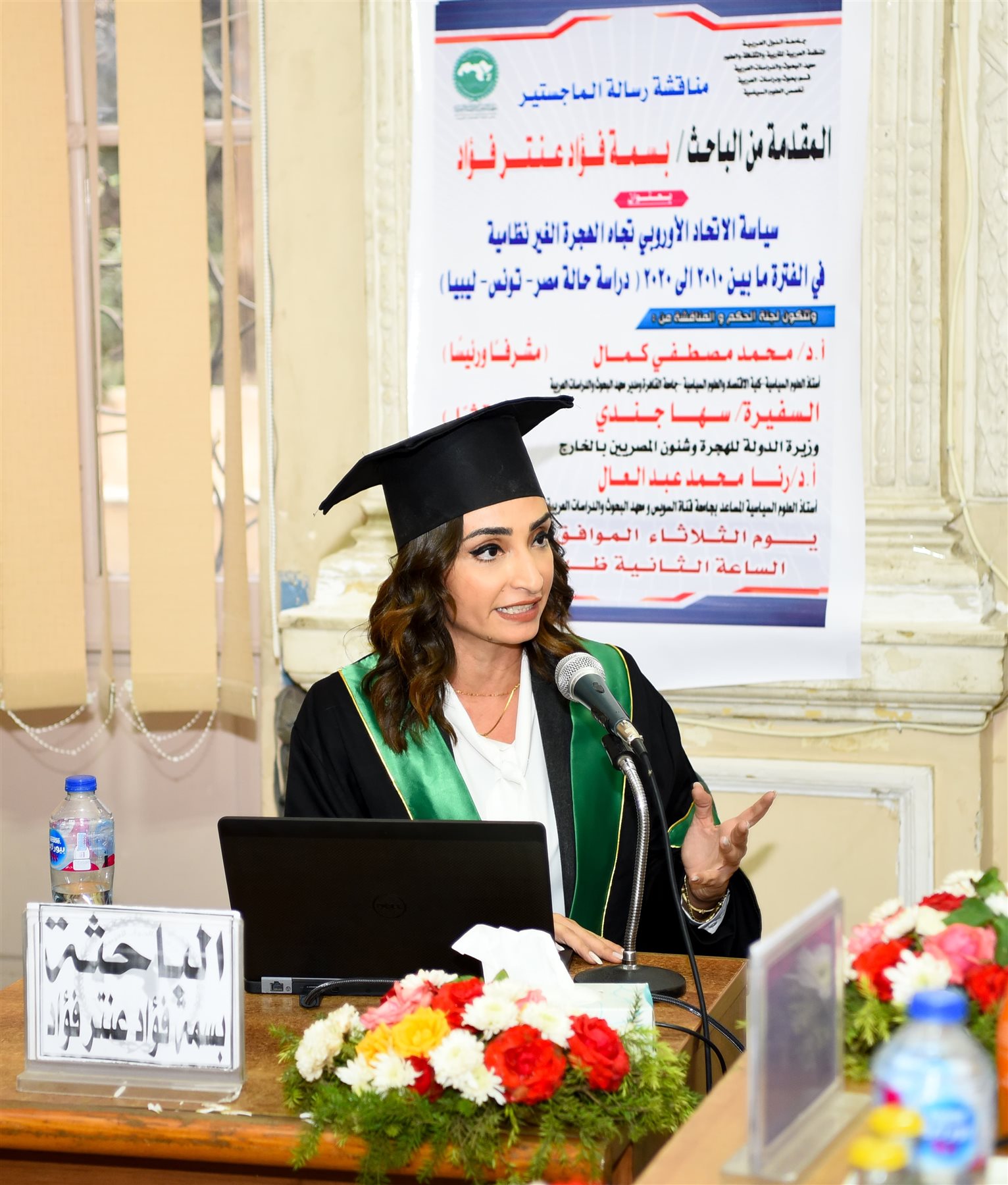 ومن ناحيتها، أعربت الباحثة عن شكرها للسفيرة سها جندي، وزيرة الهجرة، لقبولها المشاركة في مناقشة الرسالة، ومناقشة ما قدمته الدولة المصرية في هذه القضية الحيوية، باعتبارها دولة مرور ودولة هجرة ودولة استقبال للمهاجرين، مشيرة إلى أن تركيزها على الشق الخاص بتصدير الهجرة غير النظامية لم يكن الا لبحث الاسباب وايجاد حلول وتوصيات للتعامل والقضاء على الظاهرة.