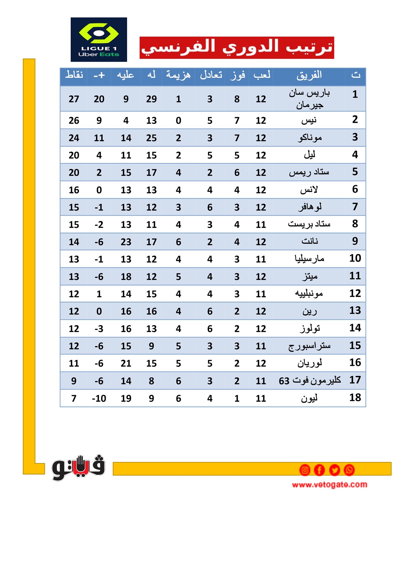 ترتيب الدوري الفرنسي بعد الجولة الـ 12