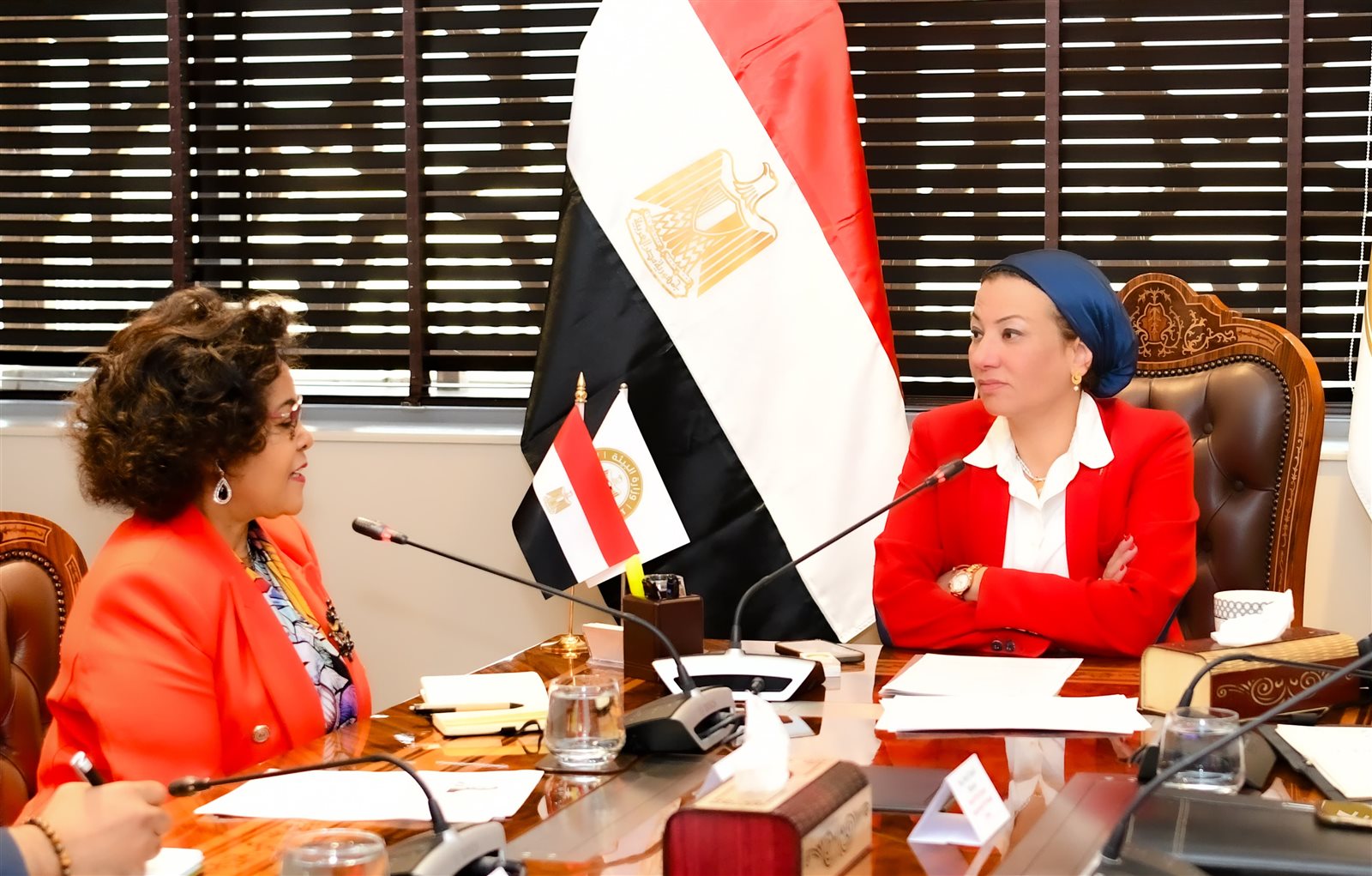 التقت الدكتورة ياسمين فؤاد وزيرة البيئة مع ناردوس بيكيلي توماس المديرة التنفيذية لوكالة الاتحاد الأفريقي للتنمية "نيباد" والوفد المرافق لها، بحضور المستشار محمد الشرقاوي ممثلا عن السفير أشرف سويلم مساعد وزير الخارجية والممثل الشخصي للرئيس في النيباد، وذلك لمناقشة آخر مستجدات الإعداد لتوقيع اتفاقية استضافة مصر لمركز التميز للتكيف والمرونة مع التغيرات المناخية.