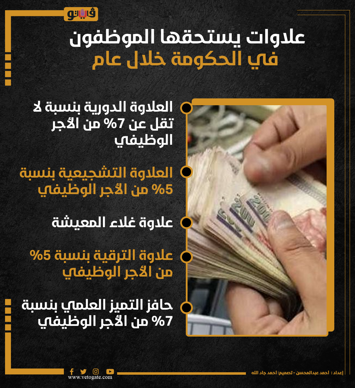 علاوات يستحقها الموظفون في الحكومة خلال عام (إنفوجراف) السبت 02/ديسمبر/2023 - 10:25 ص 12/2/2023 10:25:13 AM علاوات الموظفين في الحكومة، فيتو أحمد عبدالمحسن شارك طباعة 18 حجم الخط شارك طباعة الأجر الوظيفى الموظفين في الحكومة العلاوة التشجيعية العلاوة الدورية حافز التميز العلمي موظفين في الحكومة علاوة غلاء المعيشة علاوة الترقية