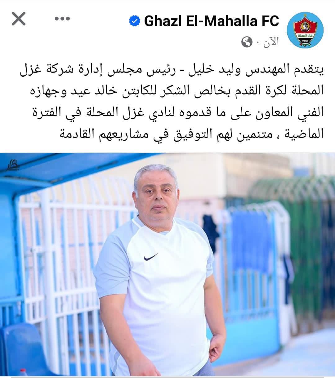 وجه مجلس إدارة نادي غزل المحلة برئاسة المهندس وليد خليل الشكر للجهاز الفني للفريق الأول لكرة القدم بالنادي بقيادة الكابتن خالد عيد، بعد تراجع مستوي الفريق خلال منافسات دوري المحترفين.