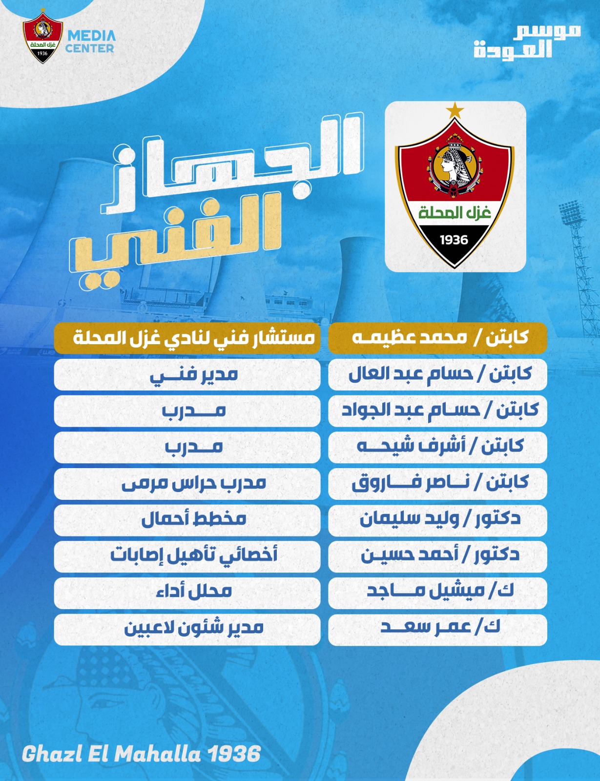 غزل المحلة، قرر مجلس إدارة شركة غزل المحلة لكرة القدم برئاسـة وليد خليل تعيين الكابتن محمد عظيمه مستشارًا فنيًّا للنـادي، وتشكيل جهاز فني جديد للفريق الأول بقيـادة حسـام عبد العال - مديرًا فنيــًا ويعاونه كل من: