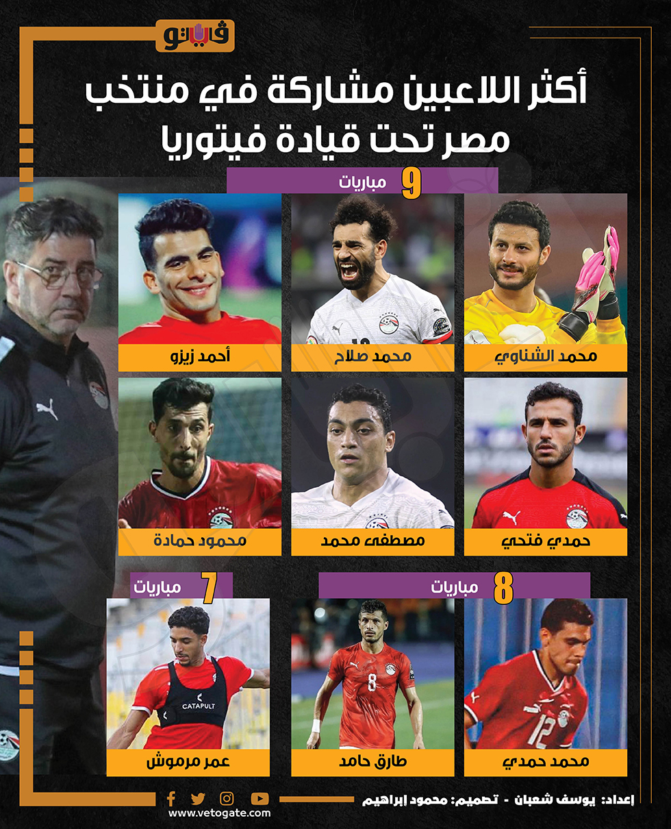 أكثر اللاعبين مشاركة في منتخب مصر تحت قيادة فيتوريا (إنفوجراف) الخميس 16/نوفمبر/2023 - 03:51 م 11/16/2023 3:51:32 PM روي فيتوريا مع محمد صلاح، فيتو يوسف شعبان شارك طباعة 18 حجم الخط شارك طباعة منتخب مصر روي فيتوريا منتخب جيبوتي التصفيات المؤهلة لنهائيات كأس العالم 2026 محمد الشناوي محمد صلاح