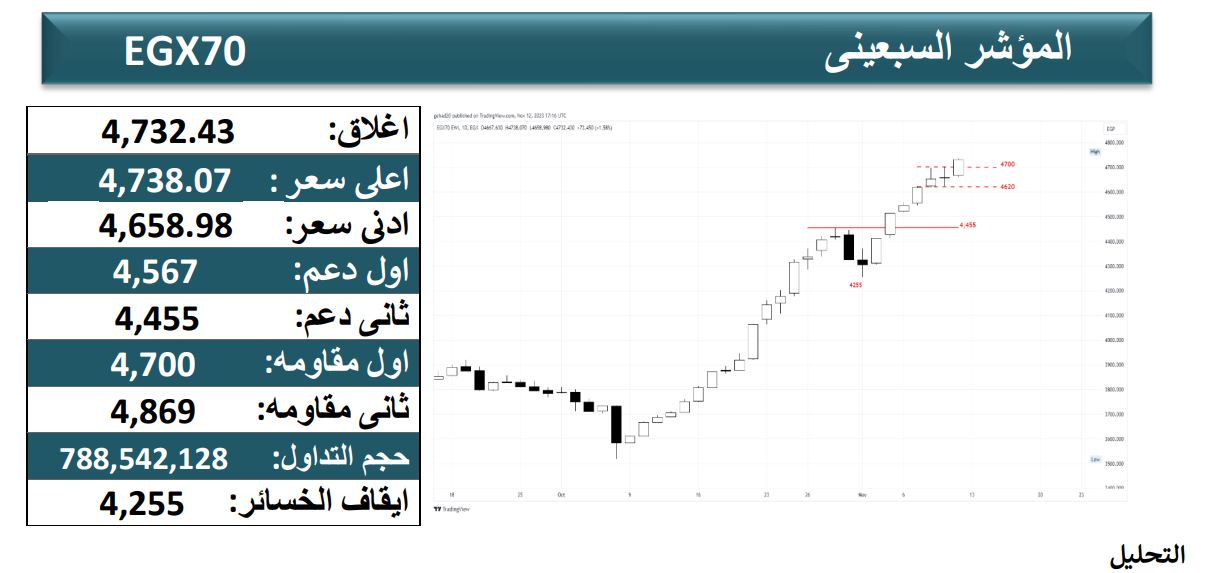 كما صعد مؤشر الشركات الصغيرة والمتوسطة "إيجي إكس 70 متساوي الأوزان" بنسبة 0.1% عند مستوى 4701 نقطة، وصعد مؤشر "إيجي إكس 100 متساوي الأوزان" بنسبة 0.61% عند مستوى 6987 نقطة.