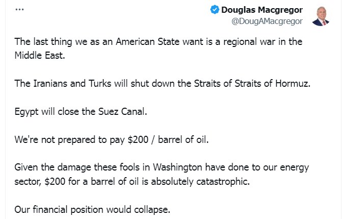 وعن حرب غزة الآن، وتوقع حدوث حرب إقليمية في الشرق الأوسط، أكد الجنرال الأمريكي دوجلاس ماكجريجور أن التوسع في حرب إقليمية سيؤدي لغلق إيران لمضيق هرمز، وغلق مصر لقناة السويس، ما سيؤدي لارتفاع سعر برميل البترول إلى 200 دولار، وذلك يعتبر كارثة بالنسبة لأمريكا.