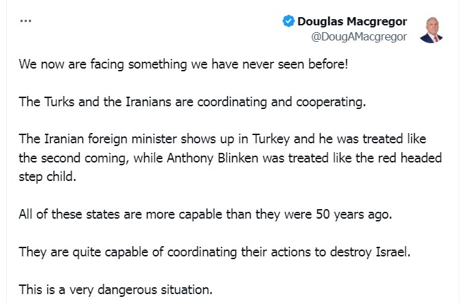 كما عبر دوجلاس ماكجريجور عن اندهاشه من التنسيق التركي الإيراني بشأن الحرب في غزة، فقال: "نحن الآن أمام شيء لم نره من قبل! الأتراك والإيرانيون ينسقون ويتعاونون. ظهر وزير الخارجية الإيراني في تركيا، وتم التعامل معه وكأنه في زيارته الثانية لتركيا، في حين تم التعامل مع أنتوني بلينكن مثل ابن الزوج ذو الرأس الأحمر، أي الرجل الـ"شرير".