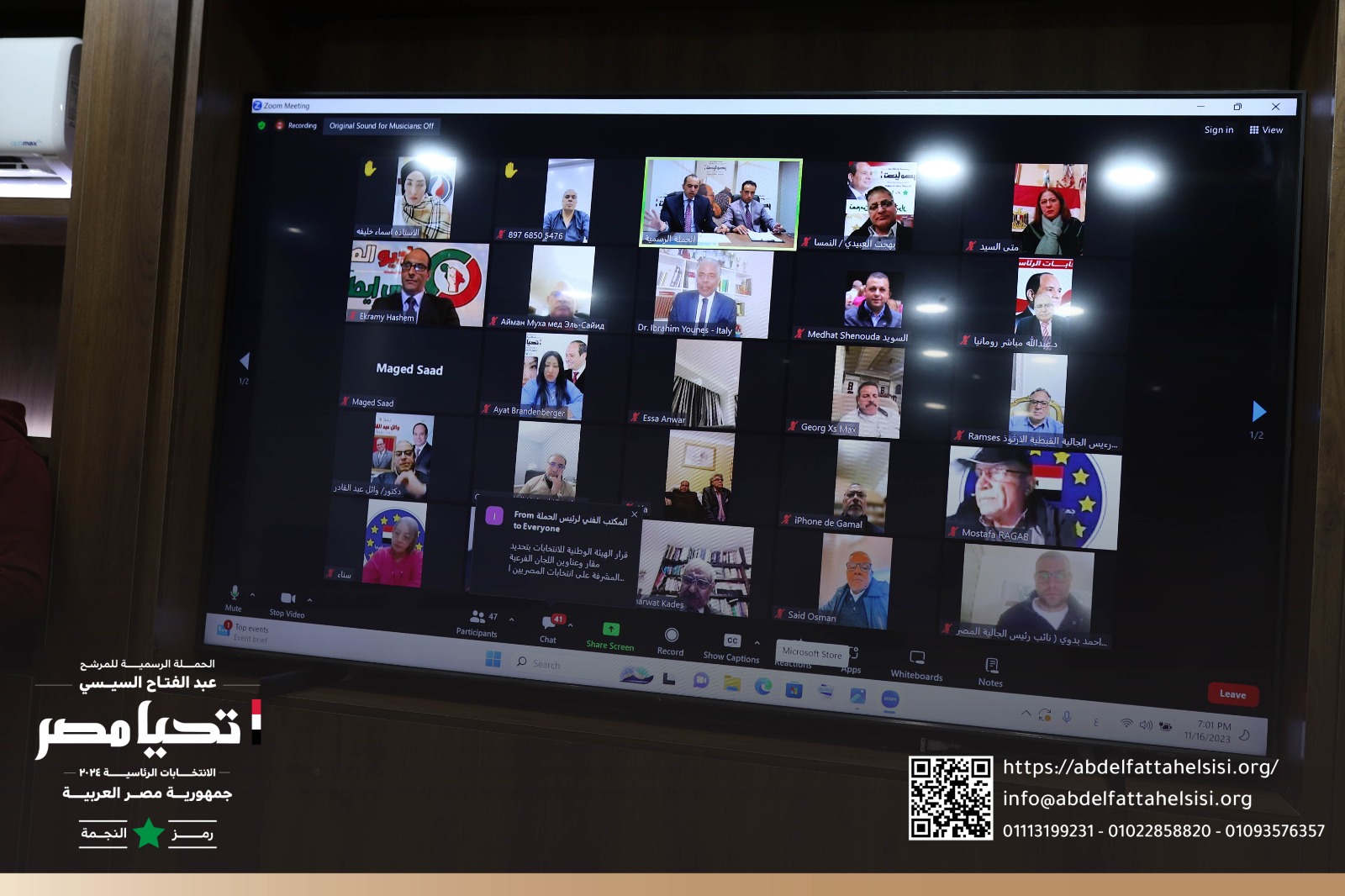 وفي بداية اللقاء عبر المستشار محمود فوزي رئيس الحملة الرسمية للمرشح الرئاسي عبد الفتاح السيسي عن سعادته وترحيبه بالمشاركين في اللقاء عبر "الفيديو كونفرانس" من مختلف دول العالم، مشيرًا إلى إنجازات القيادة السياسية في ملف المصريين في الخارج من ناحية إطلاق المبادرات المختلفة لتلبية مطالبهم وتسهيل التواصل معهم، كما تمت مناقشة بعض المسائل التنظيمية خاصة مع قرب موعد إجراء الانتخابات في الخارج.