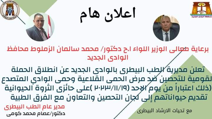 تستعد مديرية الطب البيطري بالوادي الجديد، لإطلاق الحملة القومية الثالثة خلال العام الجاري 2023 لتحصين الماشية ضد الحمى القلاعية وحمى الوادي المتصدع، وذلك يوم الأحد المقبل 19 نوفمبر، للحفاظ على الثروة الحيوانية من الإصابة بالأمراض الوبائية، من خلال الفرق البيطرية الثابتة والمتحركة بالقرى والمدن بمراكز المحافظة الإدارية الخمسة.