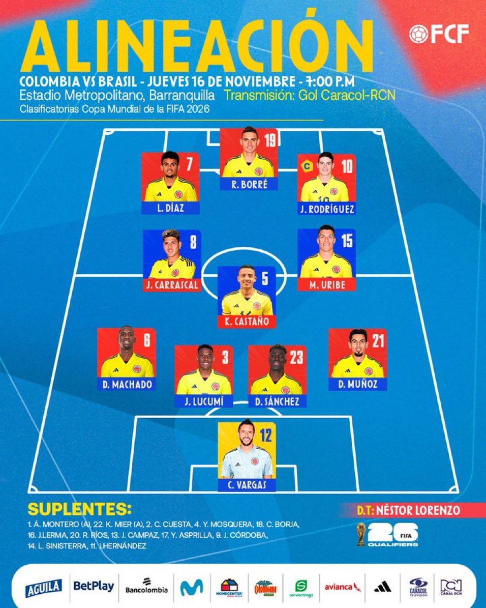تصفيات كأس العالم، أعلن التشكيل الرسمي لمباراة كولومبيا ضد البرازيل في تصفيات أمريكا الجنوبية المؤهلة لبطولة كأس العالم 2026.