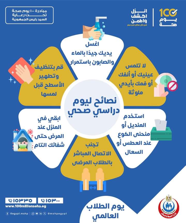 وجهت وزارة الصحة نصائح في يوم الطلاب العالمي لتلاميذ المدارس للحماية من الأمراض واتباع طرق الوقاية والحماية وتطبيق الإجراءات الاحترازية تجنبا للإصابة باي عدوى.