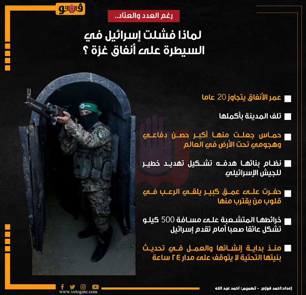رغم العدد والعتاد.. لماذا فشلت إسرائيل في السيطرة على أنفاق غزة ؟ (انفوجراف) الأحد 19/نوفمبر/2023 - 11:27 ص 11/19/2023 11:27:11 AM أنفاق غزة، فيتو احمد فوزي شارك طباعة 18 حجم الخط شارك طباعة أنفاق غزة حصن دفاعي إسرائيل حماس الجيش الإسرائيلي
