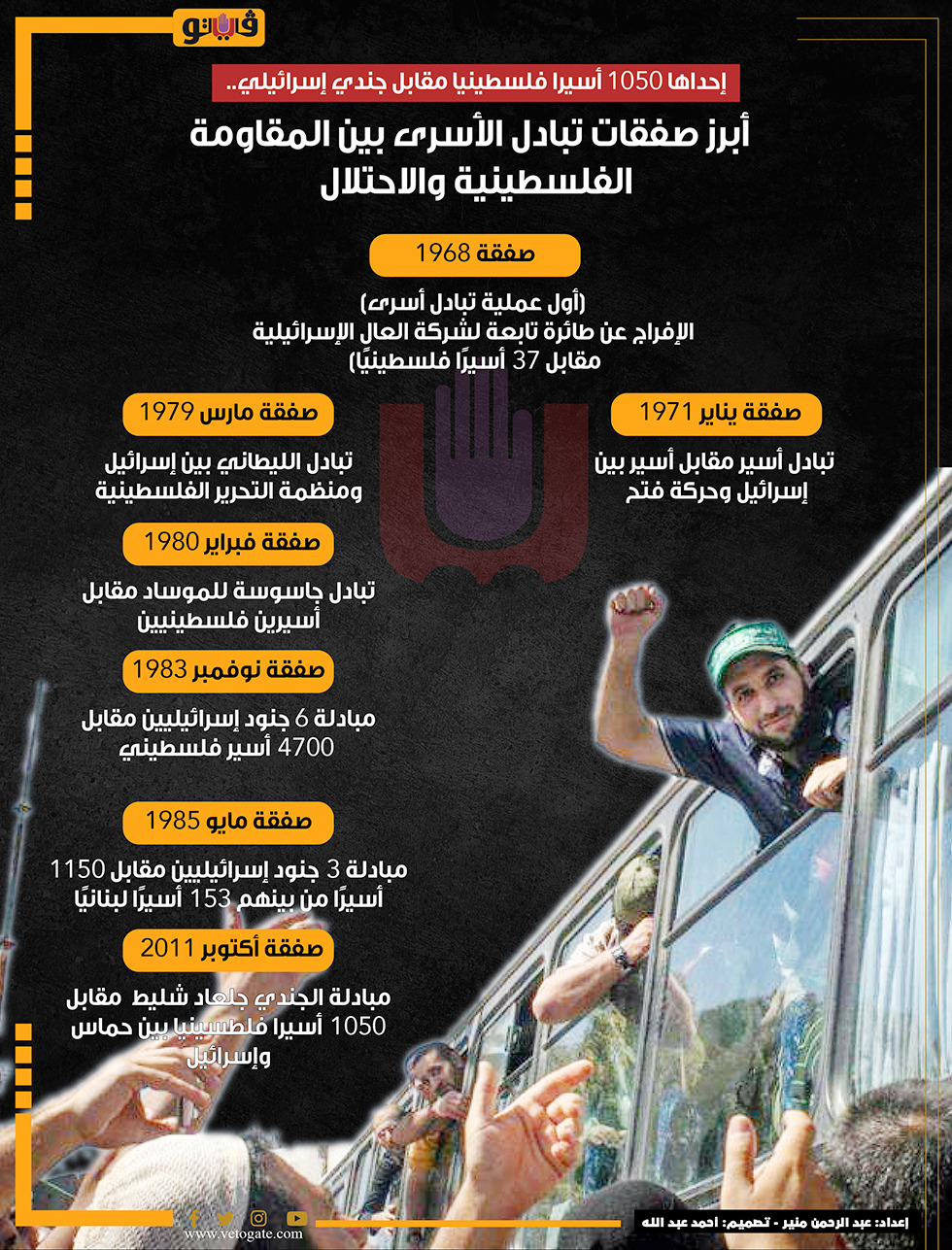 إحداها 1050 أسيرا فلسطينيا مقابل جندي إسرائيلي.. أبرز صفقات تبادل الأسرى بين المقاومة الفلسطينية والاحتلال (انفوجراف) الأحد 19/نوفمبر/2023 - 01:32 م 11/19/2023 1:32:36 PM الأسرى الإسرائيليين، فيتو عبدالرحمن منير شارك طباعة 18 حجم الخط شارك طباعة عملية تبادل أسرى بين إسرائيل وفلسطين إسرائيل فتح منظمة التحرير الفلسطينية صفقة تبادل الأسرى الاسري الإسرائيليين