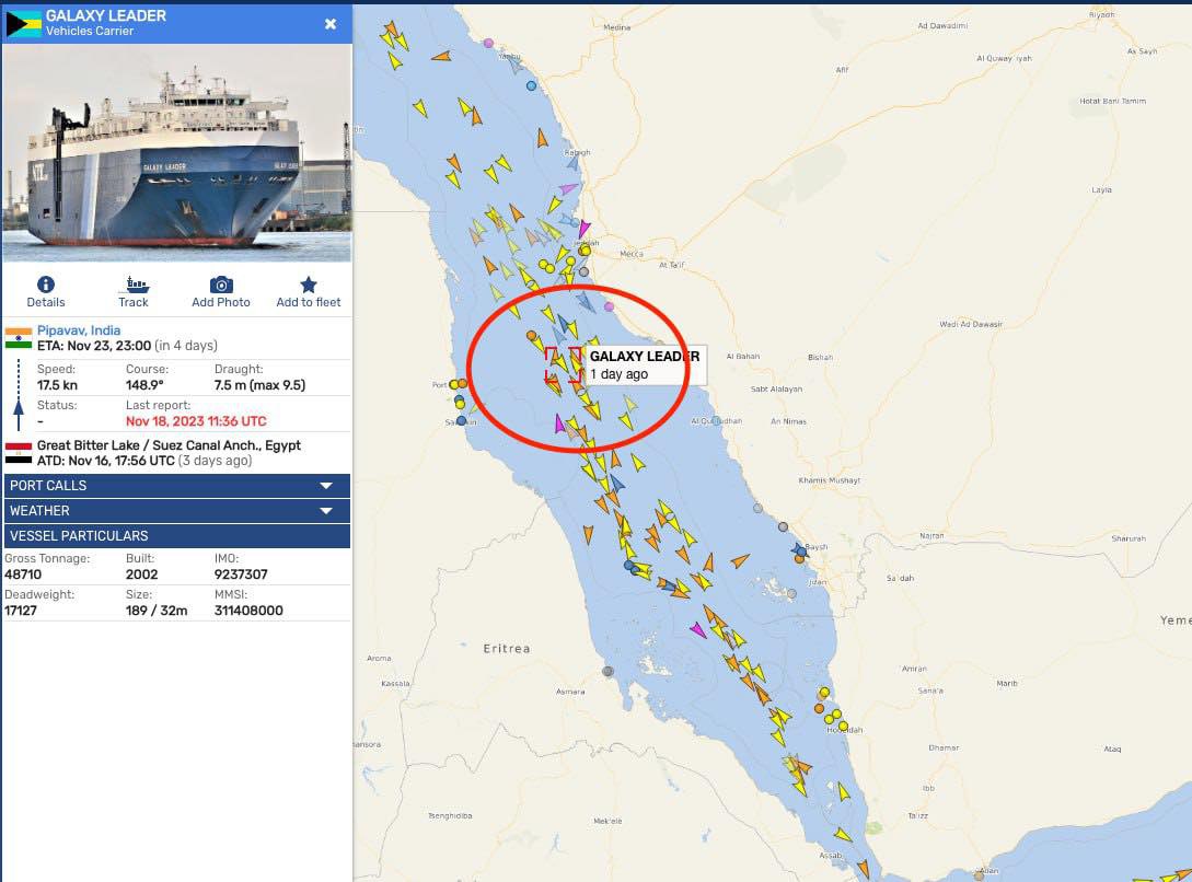 وأشارت المعلومات المتوفرة عن السفينة في موقع «مارينا ترافيك» إلى أن السفينة "جالاكسي ليدر"، مخصصة لنقل البضائع (حاملة سيارات) وتم بناؤها في عام 2002.