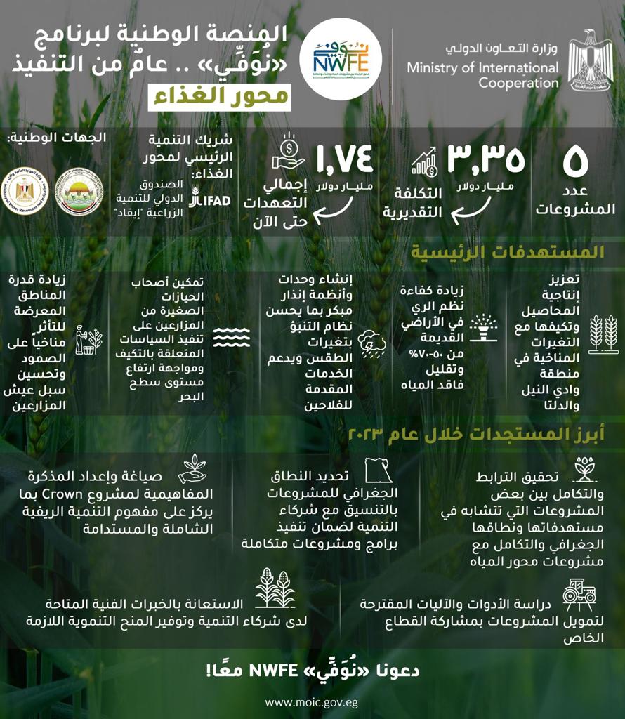 كشف تقرير المتابعة الأول الذي أصدرته وزارة التعاون الدولي، حول التقدم المحرز في تنفيذ المنصة الوطنية لبرنامج «نوفي»، عن نتائج التنسيق مع شركاء التنمية متعددي الأطراف والثنائيين والجهات الوطنية على مدار العام الماضي، فيما يتعلق بتنفيذ مشروعات محور الغذاء ضمن برنامج «نوفي»، والذي يتضمن تنفيذ 5 مشروعات وهي تكيف إنتاج المحاصيل في وادي النيل والدلتا، وتعزيز التكيف في شمال الدلتا المتأثرة بارتفاع مستوى سطح البحر، وتحقيق المرونة بالمناطق النائية والأكثر احتياجا، وتحديث نظم الري في الأراضي الزراعية القديمة، وإنشاء نظام إنذار مبكر.