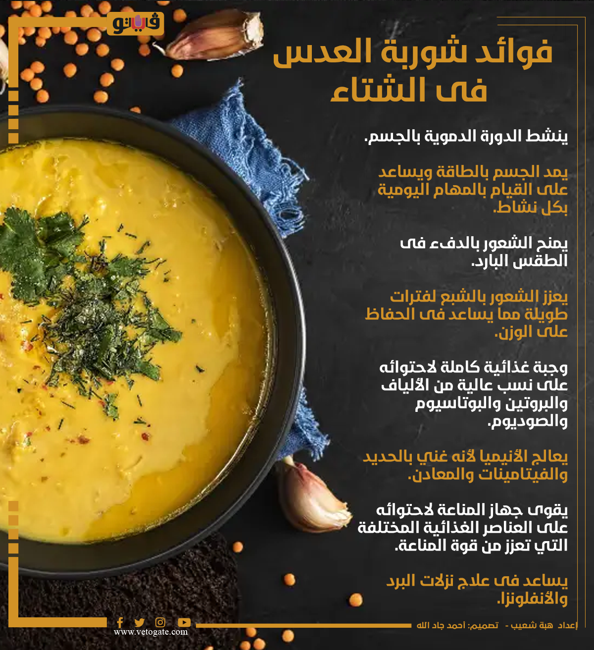 فوائد شوربة العدس فى الشتاء (انفوجراف) الثلاثاء 28/نوفمبر/2023 - 12:32 م 11/28/2023 12:32:24 PM شوربة العدس، فيتو هبة شعيب شارك طباعة 18 حجم الخط شارك طباعة شوربة العدس الشتاء فوائد شوربة العدس فى الشتاء الدكتورة منى أيمن صحة الصحة