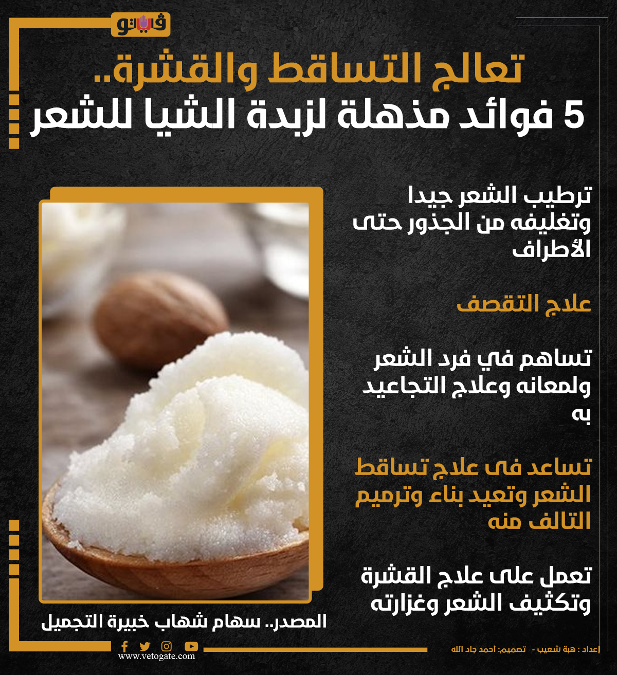 تعالج التساقط والقشرة.. 5 فوائد مذهلة لزبدة الشيا للشعر (إنفوجراف) الخميس 15/فبراير/2024 - 10:31 م 2/15/2024 10:31:41 PM فوائد زبدة الشيا، فيتو هبة شعيب شارك طباعة 18 حجم الخط المصدر.. سهام شهاب خبيرة التجميل شارك طباعة زبدة الشيا فوائد زبدة الشيا فوائد زبدة الشيا للشعر سهام شهاب خبيرة التجميل علاج الشعر