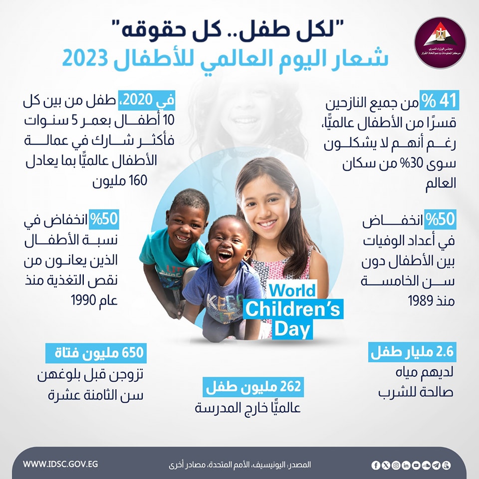 نشرت الصفحة الرسمية لمركز المعلومات ودعم اتخاذ القرار بمجلس الوزراء إنفوجراف جديد تحت عنوان (لكل طفل.. كل حقوقه، شعار اليوم العالمي للأطفال 2023).