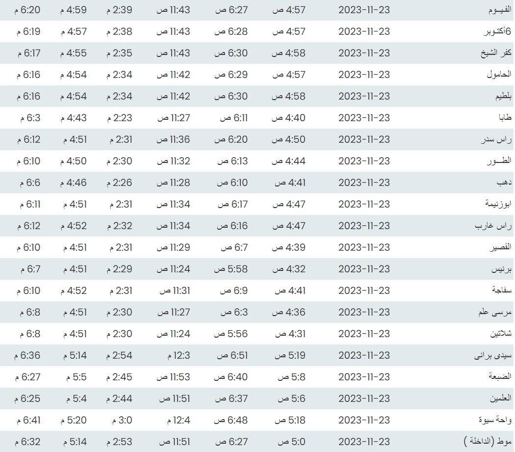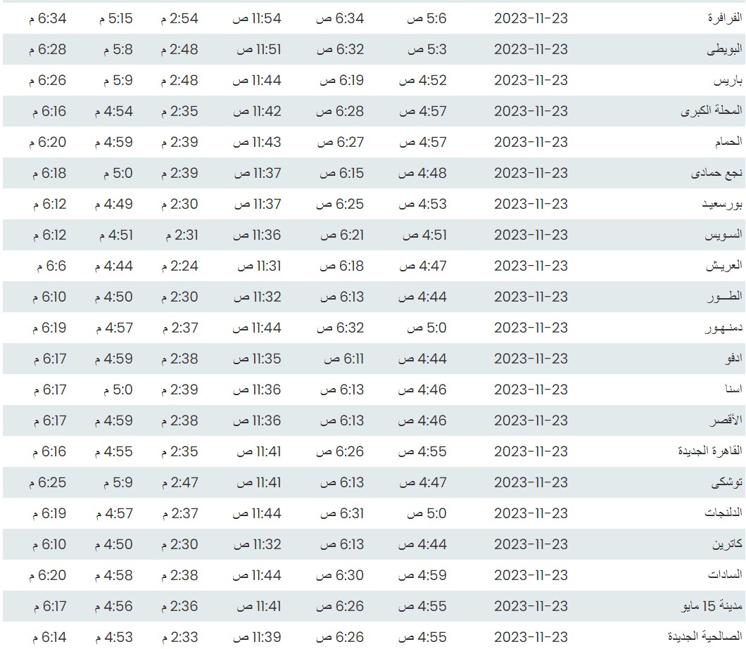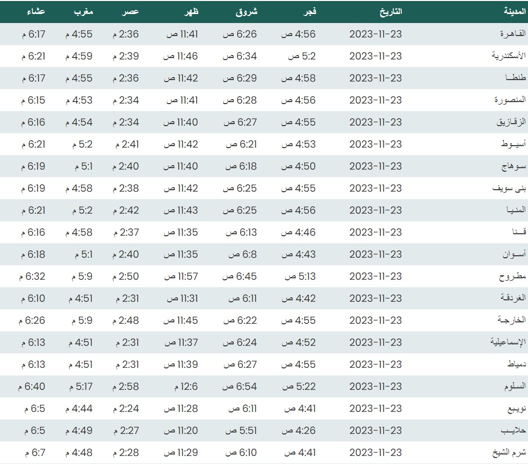 مواقيت الصلاة اليوم وفقًا للتوقيت المحلي لمدينتي القاهرة والإسكندرية وكذلك،مواقيت الصلاة، لعدد من مدن ومحافظات الجمهورية من واقع بيانات الهيئة العامة للمساحة