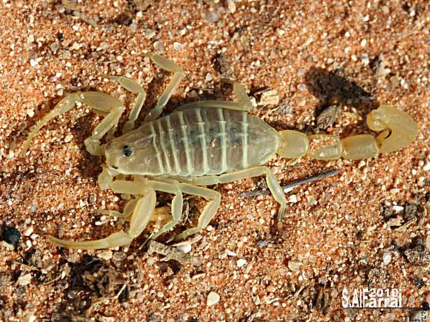 اسمها العلمي " Compsobuthus arabicus" وهي من العقارب الصغيرة ذات اللون الأصفر الفاتح، وتتمير بأعينها التي تتوسط مُقدمة الرأس.