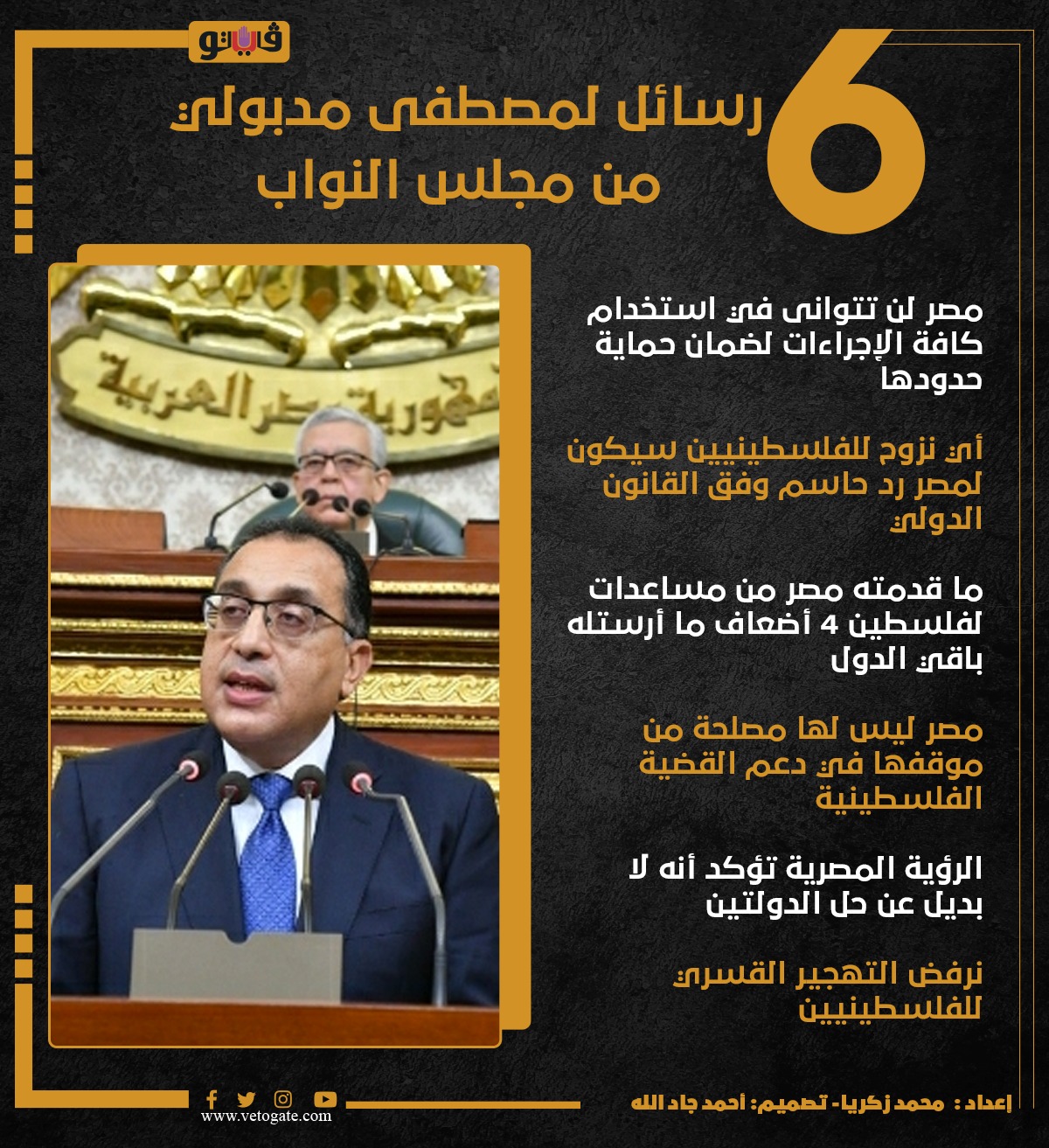 مصر لن تتوانى عن استخدام كافة الإجراءات التي تضمن حماية وصون حدودها وحال حدوث أي سيناريو يستهدف نزوح الفلسطينيين إلى الأراضي المصرية سيكون لها رد حاسم وفقًا لأحكام القانون الدولي - مصطفي مدبولي رئيس الوزراء -