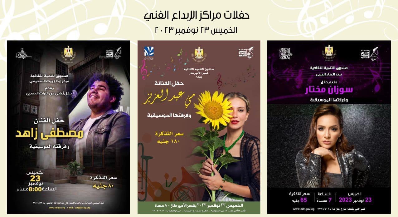 يقيم قطاع صندوق التنمية الثقافية، مساء غد الخميس الموافق 23 نوفمبر الجاري، مجموعة من الحفلات الموسيقية المتنوعة بمراكز الإبداع المختلفة التابعة.