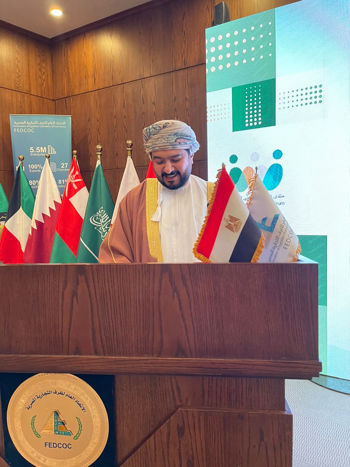 ومن جانبه أكد قيس بن محمد اليوسف وزير التجارة والصناعة وترويج الاستثمار العماني على عمق العلاقات الاستراتيجية بين مصر ودول مجلس التعاون الخليجي، مشددًا على ضرورة عقد لقاء سنوي منتظم للمنتدى لتنفيذ توصياته والبحث عن حلول فنية وإقامة منصة بين الغرف العربية دورها عرض المناقصات والفرص الاستثمارية بمصر ودول مجلس التعاون الخليجي.