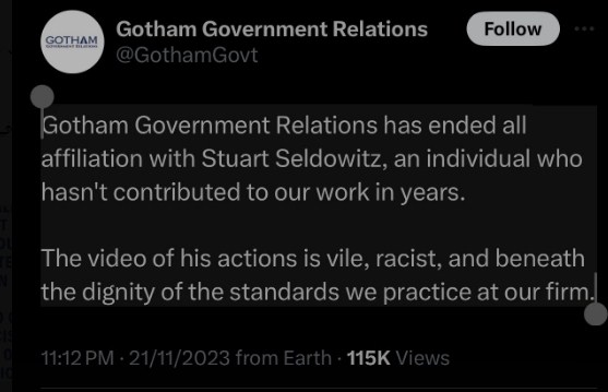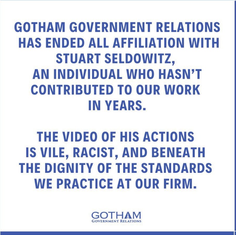 وقالت مؤسسة العلاقات الحكومية الأمريكية في بيان لها: "لقد أنهت العلاقات الحكومية في جوثام كل الارتباط مع ستيوارت سيلدويتز، وهو شخص لم يساهم في عملنا منذ سنوات، حيث يُظهر مقطع الفيديو المنتشر أفعالا عنصرية وتحط من كرامة المعايير التي نمارسها في شركتنا".