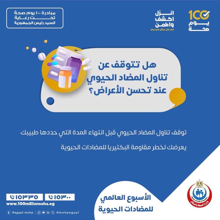 وأكدت وزارة الصحة في منشور توعوي لها ضرورة تناول الجرعة الكاملة للمضاد الحيوي وعدم التوقف عن تناولها إلا بتعليمات الطبيب حتى لا تحدث مقاومة للمضادات الحيوية.
