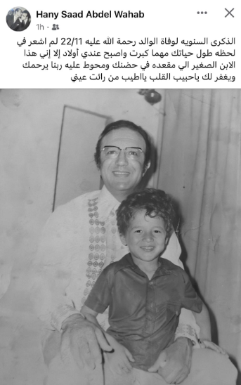ونشر نجل الفنان الراحل صورا نادرة تجمعه بوالده، وعلق عليها قائلا: "الذكرى السنوية لوفاة الوالد رحمة الله عليه، 22/11، لم أشعر فى لحظة طول حياتك مهما كبرت وأصبح عندى أولاد، إلا أنى هذا الابن الصغير اللى مقعده فى حضنك ومحوط عليه.. ربنا يرحمك ويغفر لك يا حبيب القلب، يا أطيب من رأت عينى".