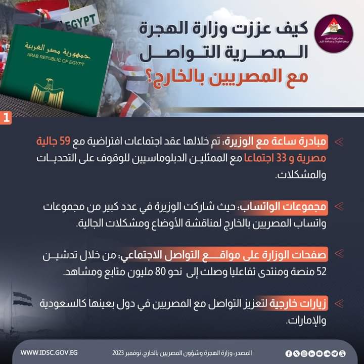 نشرت الصفحة الرسمية لمركز المعلومات ودعم اتخاذ القرار بمجلس الوزراء، إنفوجراف جديدا تحت عنوان (كيف عززت وزارة الهجرة المصرية التواصل مع المصريين في الخارج).