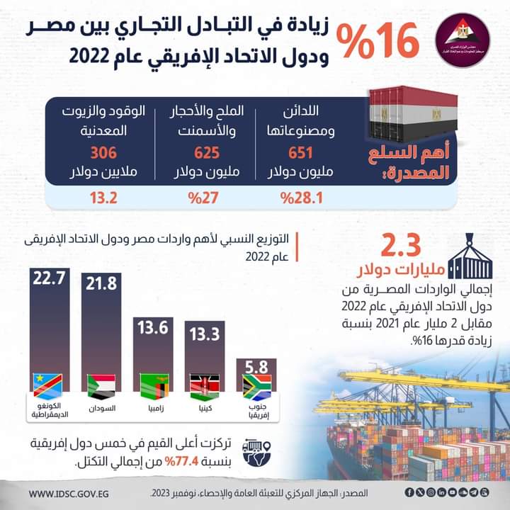 كما نشرت الصفحة الرسمية لمركز المعلومات ودعم اتخاذ القرار بمجلس الوزراء إنفوجراف جديدا تحت عنوان (%16 زيادة في التبادل التجاري بين مصر ودول الاتحاد الإفريقي عام 2022 ).