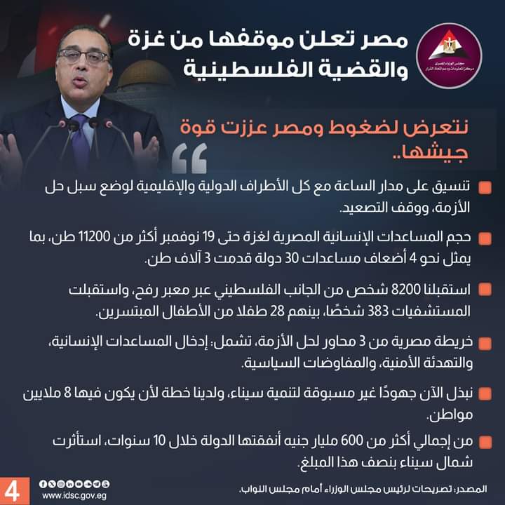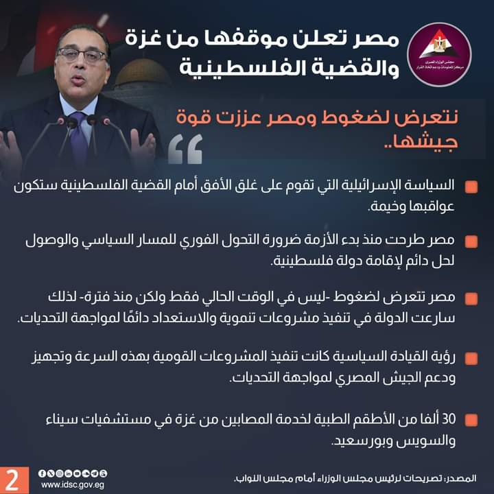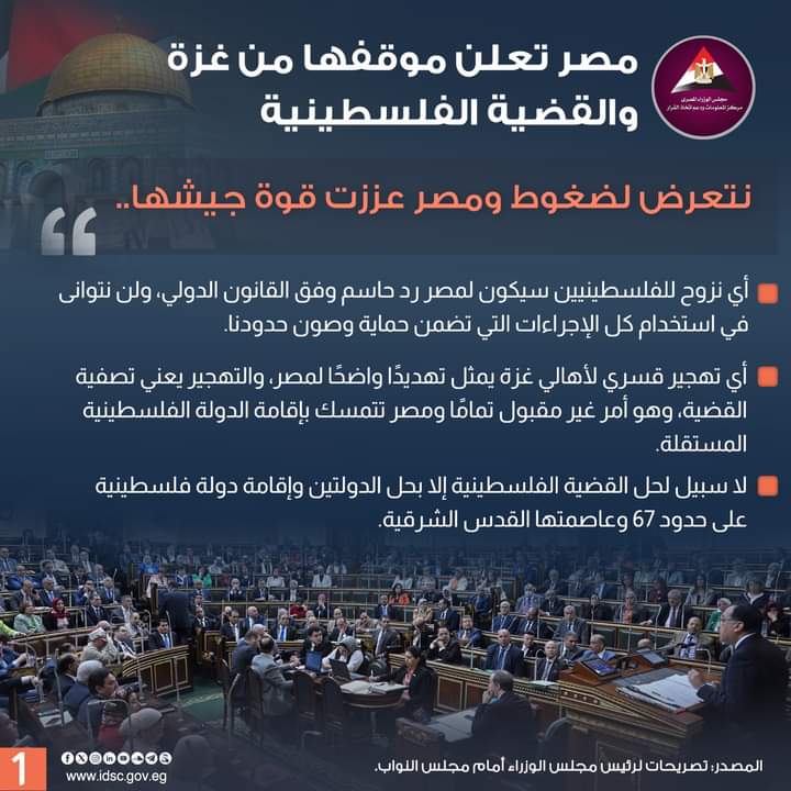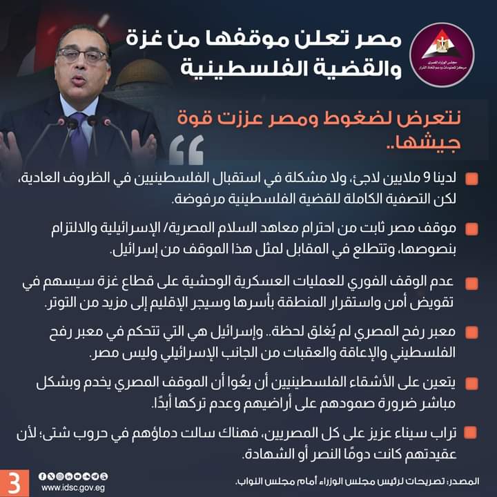 نشرت الصفحة الرسمية لمركز المعلومات ودعم اتخاذ القرار بمجلس الوزراء إنفوجراف جديدا تحت عنوان (مصر تعلن موقفها من غزة والقضية الفلسطينية).