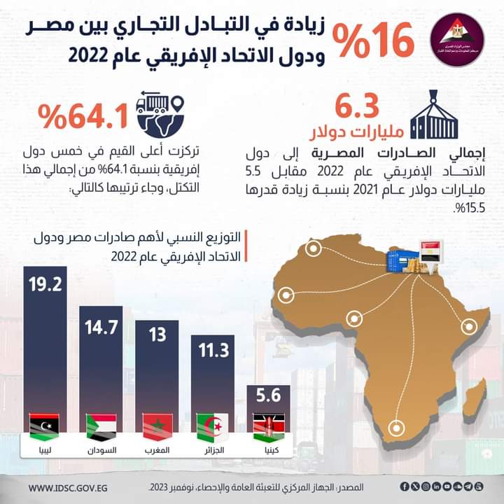 كما نشرت الصفحة الرسمية لمركز المعلومات ودعم اتخاذ القرار بمجلس الوزراء إنفوجراف جديد تحت عنوان (%16 زيادة في التبادل التجاري بين مصر ودول الاتحاد الأفريقي عام 2022 ).