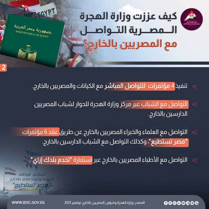 ونشرت الصفحة الرسمية لمركز المعلومات ودعم اتخاذ القرار بمجلس الوزراء إنفوجراف جديدا تحت عنوان (كيف عززت وزارة الهجرة المصرية التواصل مع المصريين في الخارج).