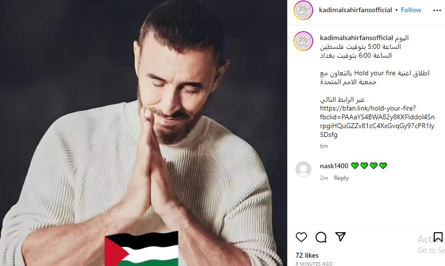 أعلن الفنان كاظم الساهر موعد طرح أغنية الجديدة Hold your fire والتي يتعاون فيها مع جمعية الأمم المتحدة، بهدف تسليط الضوء بشأن الكارثة الإنسانية في قطاع غزة، والدعوة إلى إنهاء الحرب المدمرة.