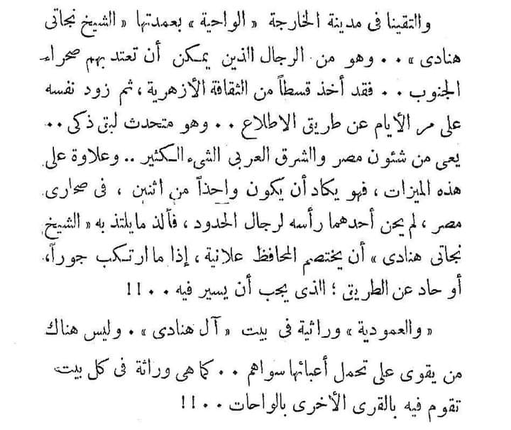 وفي التفاصيل، أن العمدة نجاتي هنادي عمدة الواحات الخارجة، اقترح على المحافظ آنذاك، أحمد عبد المنعم الذي كان مأمورا في الداخلة، ثم جاء نائبا للمحافظ ثم محافظا للجنوب، أنه من الضروري أن يكون لواحة الخارجة مجلس قروي.