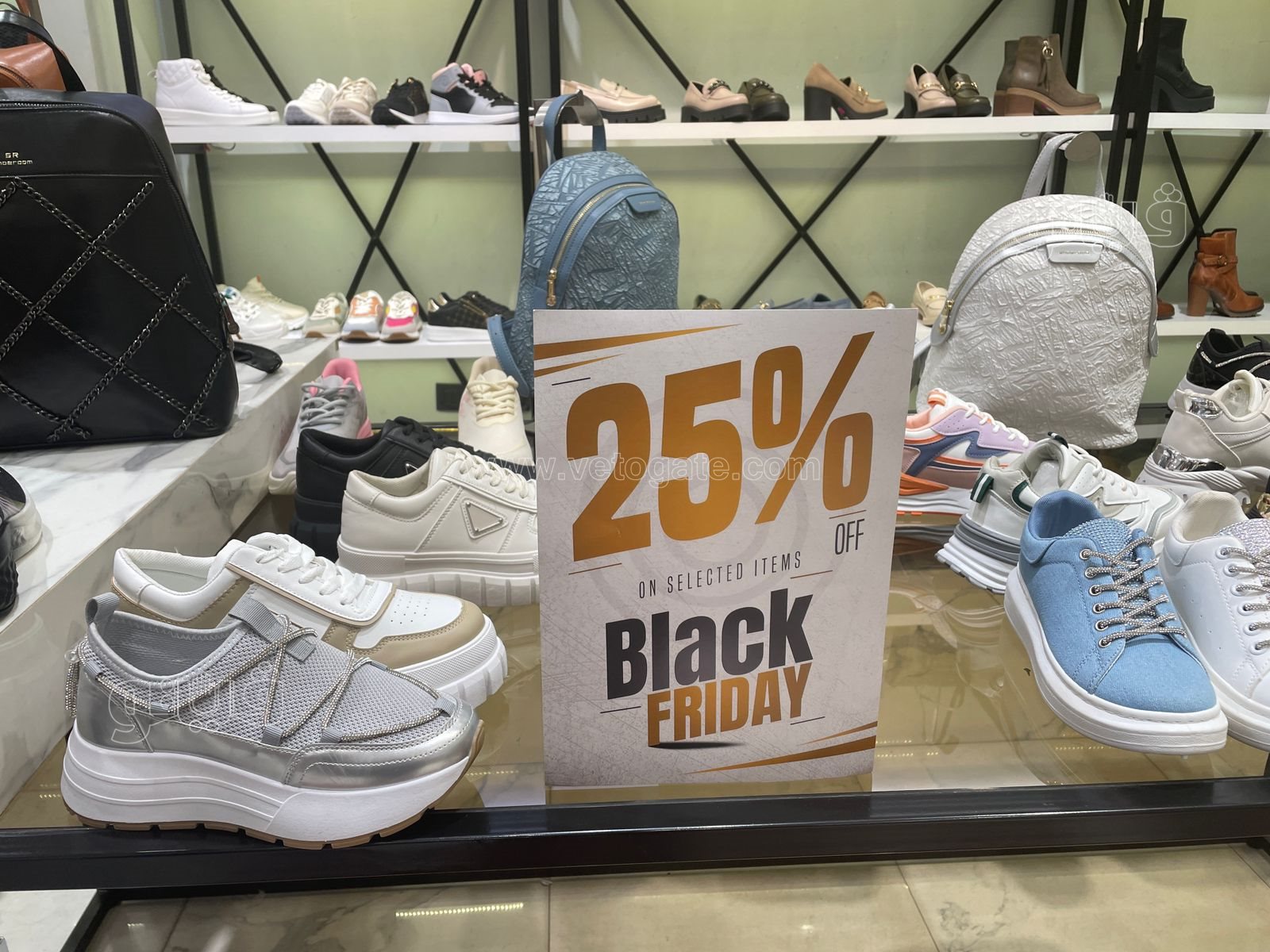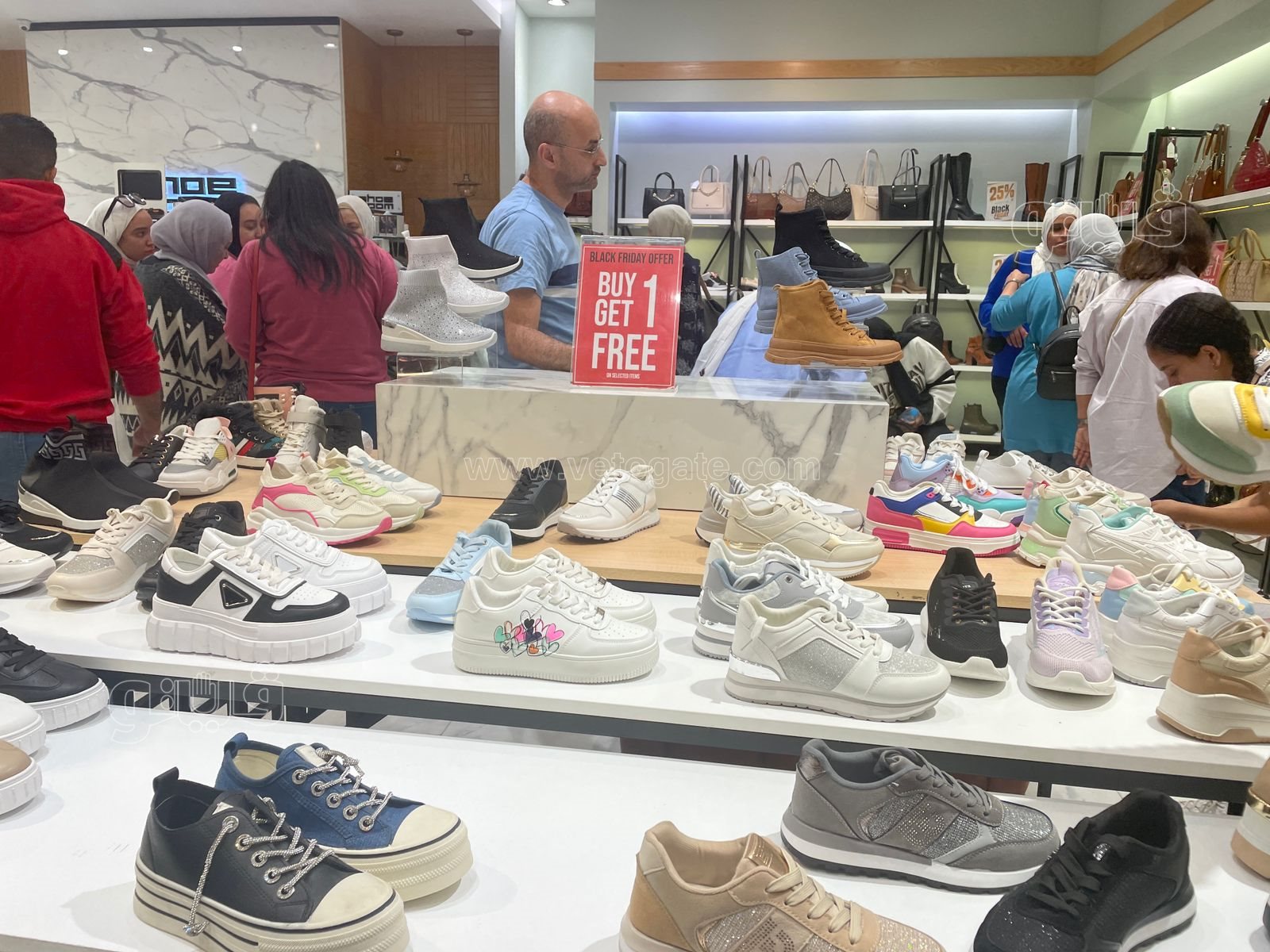 لاقت الأحذية النسائية اليوم 24 نوفمبر في الجمعة البيضاء تخفيضات وعروض عديدة في مختلف المولات وتفاوتت الأسعار من علامة تجارية إلى أخرى، ووضعت بعض المحلات لافتات تحمل شعار "قطعة عليها قطعة" على بعض منتجاتها.