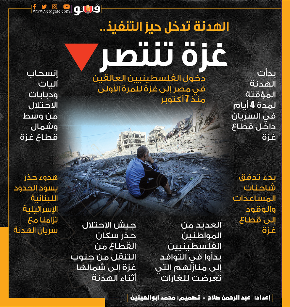 بعد 49 يوم من العدوان الإسرائيلي الغاشم على قطاع غزة بدأ رسميا اليوم الجمعة عند الساعة السابعة بالتوقيت المحلي سريان هدنة من أربعة أيام بين الاحتلال الإسرائيلي و"حماس" بوساطة مصر وقطر والولايات المتحدة.