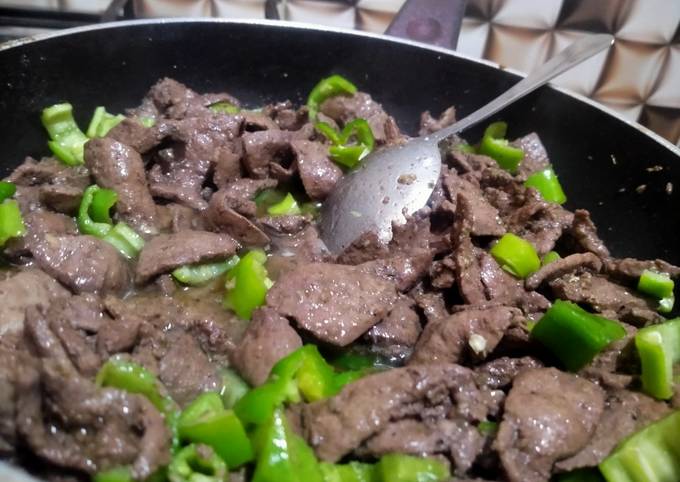 - نضيف الكبدة بعد تتبيلها، ونقلب حتى يتغير لونها.